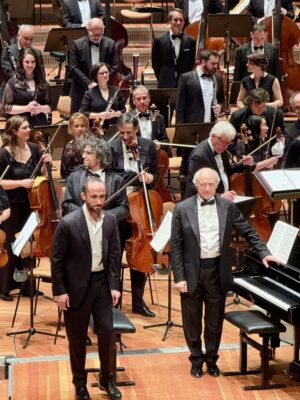 Nach der Pause erklang das am seltensten gespielte vierte Klavierkonzert B-Dur op. 53 »für die linke Hand«. Das Konzert wurde für Paul Wittgenstein geschrieben, der im ersten Weltkrieg den rechten Arm verloren hatte. Sein Musikgeschmack war allerdings äußerst konservativ, und er hat das Werk nie gespielt. (Ich frage mich ja, warum er es in Auftrag gegeben hat… Er wird doch den Stil von Prokofiew gekannt haben und hätte ahnen können, dass ein neues Werk auch für ihn nicht wesentlich altmodischer werden wird als die vorhandenen Stücke? Zumal Wittgenstein ähnliche Probleme mit den Auftragswerken von Ravel und Hindemith hatte.) Dieses Konzert spielt Igor Levit abermals nach Noten. Ich dachte mir, er könne ja dann, während die linke Hand spielt, mit der rechten umblättern. Aber nein, wie beim dritten und fünften Konzert saß eine Blätterdame bei ihm, die das übernahm. Er selbst nutze seine Rechte, um sich am Klavier und an der Bank festzuhalten – oder noch häufiger zum Mitdirigieren. Auch hier zeigt sich wieder das tiefe Empfinden der Musik, das ich so sehr schätze. Eine weitere Kleinigkeit, die mir auffiel: So extrovertiert Igor Levit zuweilen spielt, so schüchtern, fast demütig, ist seine Verbeugung nach dem Spiel. Er wirkt nicht so, als ob er sich für seine Leistung feiern lässt, sondern eher dankbar – dafür, dass er Musik machen darf, und dass ihm die Leute dabei zuhören.